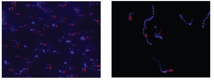 Fig. 3 E. coli staining (left) and L. casei staining (right) with CTC and DAPI. Bacterial cells were stained with CTC Rapid Staining Kit first, and then 1 μl of DAPI solution was added. The cells were incubated at room temperature for 5 min. Formaldehyde fixation with 1-4% formaldehyde can be performed before DAPI staining.