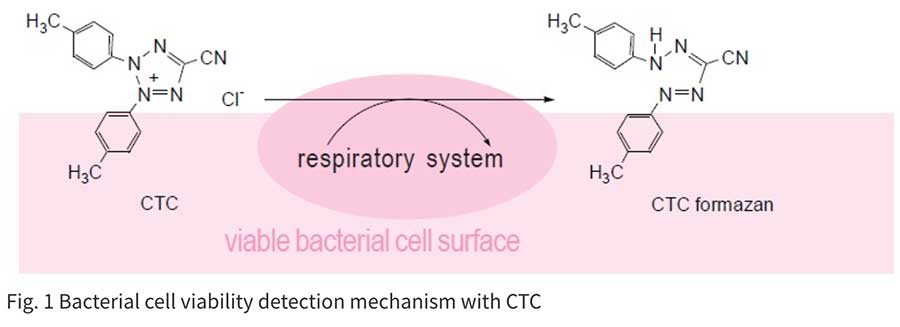 Colony formation using an agar plate is a very common and reliable method for counting bacterial cells. However, it takes quite a long time to form a colony. Therefore, alternative detection methods have been developed. Bacteria-specific gene amplification methods such as PCR, LAMP, and nucleus staining are quite rapid, but these methods count dead bacteria as well. Therefore, detection of live cell functions is essential to determining the actual number of living bacteria in a sample. Tetrazolium salts can be used to detect respiratory activity of bacterial cells or mitochondria. CTC is a tetrazolium salt and is reduced by this respiratory activity to form fluorescent CTC formazan on the cell surface. Therefore, CTC is used for specific staining of aerobic live bacteria and can be applied to hard-to-culture bacteria (VNC: viable but non-culturable). CTC forms a fluorescent formazan by an electron transfer system. However, CTC alone is not sensitive enough to stain single cells. Therefore, the CTC-Rapid Staining Kit contains an enhancing reagent that improves the CTC staining efficiency. Compared with staining with CTC only, this staining kit enables rapid and sensitive staining of microorganisms. Maximum wavelengths of the CTC formazan dye are 430 nm or 480 nm for excitation and 630 nm for emission.
