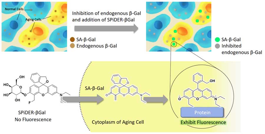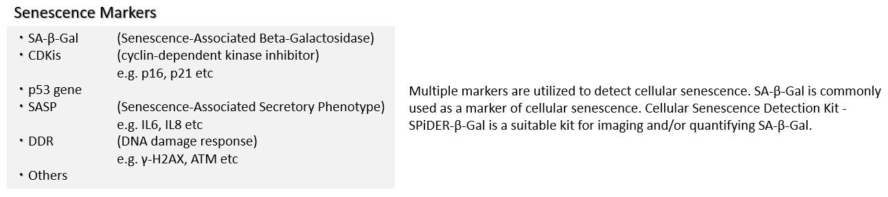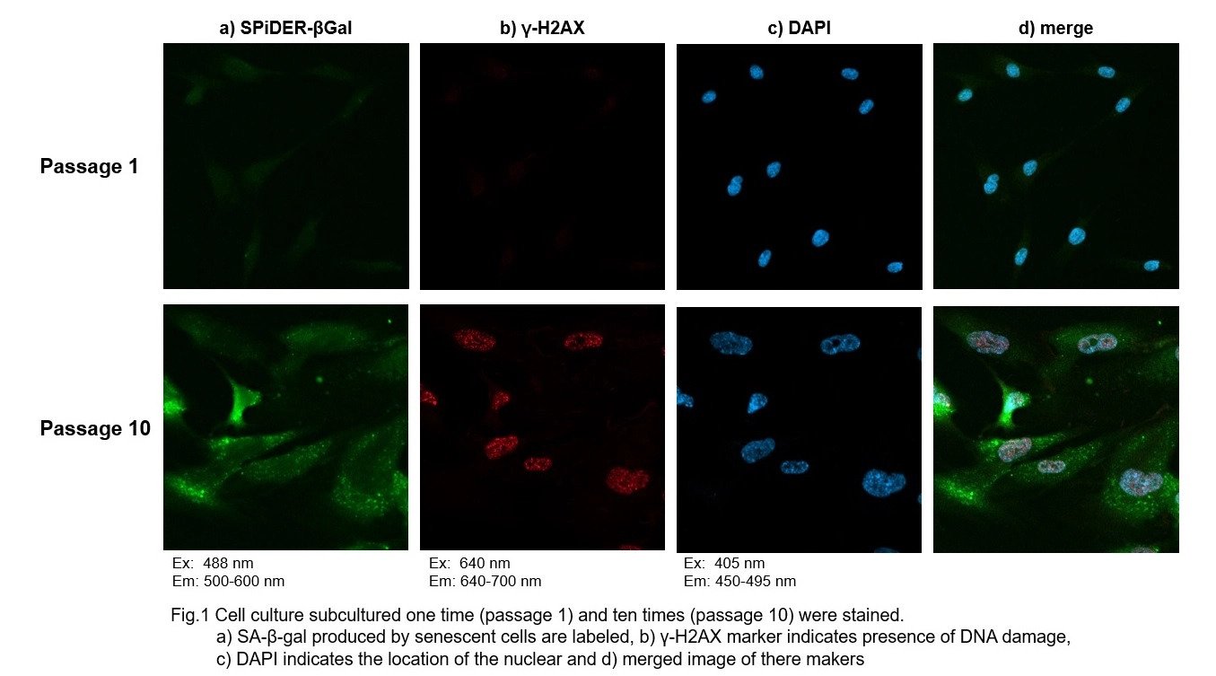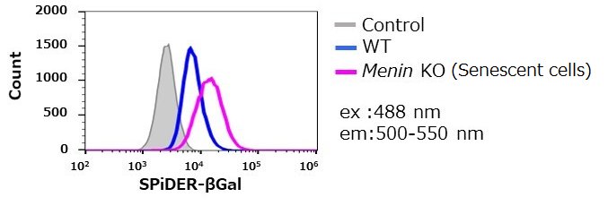 Cellular Senescence Detection Kit – SPiDER-βGal allows to detect SA-β-gal with high sensitivity and ease of use. SPiDER-βGal is a new reagent to detect β-galactosidase which possesses a high cell-permeability and a high retentivity inside cells. SA-β-gal are detected specifically not only in living cells but also fixed cells by using a reagent (Bafilomycin A1) to inhibit endogenous β-galactosidase activity. Therefore, SPiDER-βGal can be applied to quantitative analysis by flow cytometry.