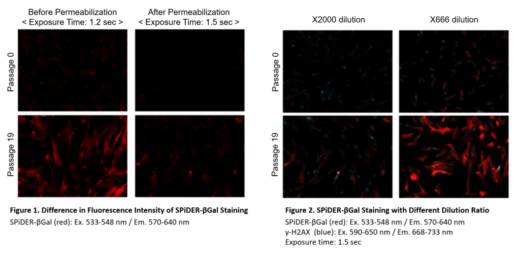 *1 Fixation and permeablization could leads to lower sensitivity (Figure 1), if you need higher signals,dilute the SPiDER-βGal DMSO stock solution 500 – 1,000 times with the McIlvaine buffer (Figure 2).