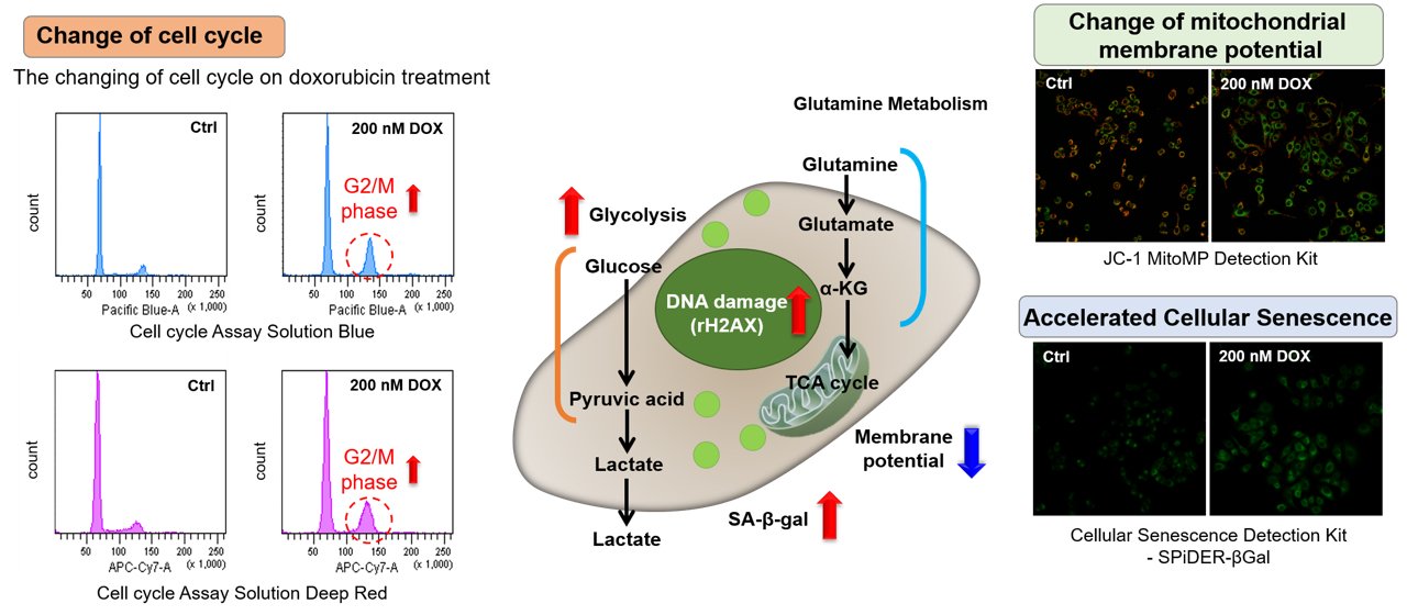 Doxorubicin (DOX) acts to inhibit cell proliferation during G2/M phases of the cell cycle and induces cellular senescence. After adding DOX to A549 cells, higher histogram peaks for the G2/M phase (Cell Cycle Assay Solution Blue and Deep Red), induces cellular senescence (Cellular Senescence Detection Kit - SPiDER-βGal), and the differences in mitochondrial membrane potential (JC-1 MitoMP Detection Kit) were observed.