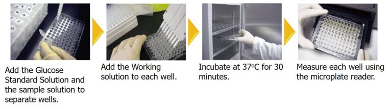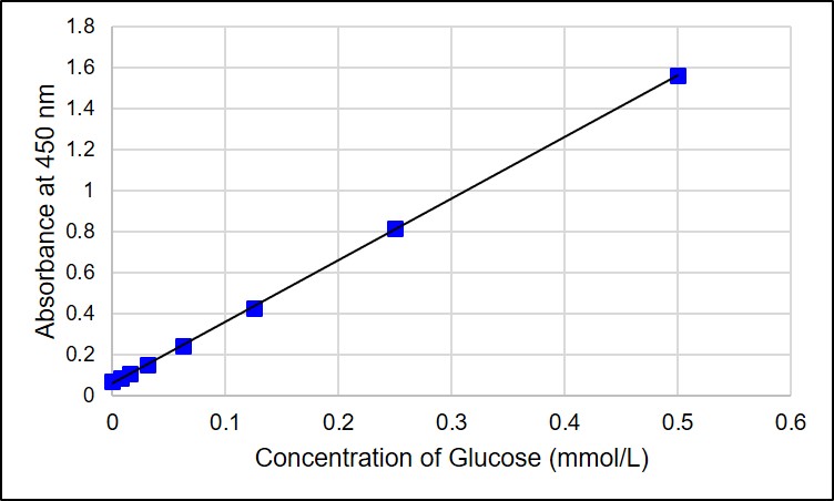 Glucose levels in a sample can be measured by a calibration curve established with Glucose Standards included in this kit. If the glucose levels are greater than or equal to 0.5 mmol/L, the sample must be diluted before measurement.