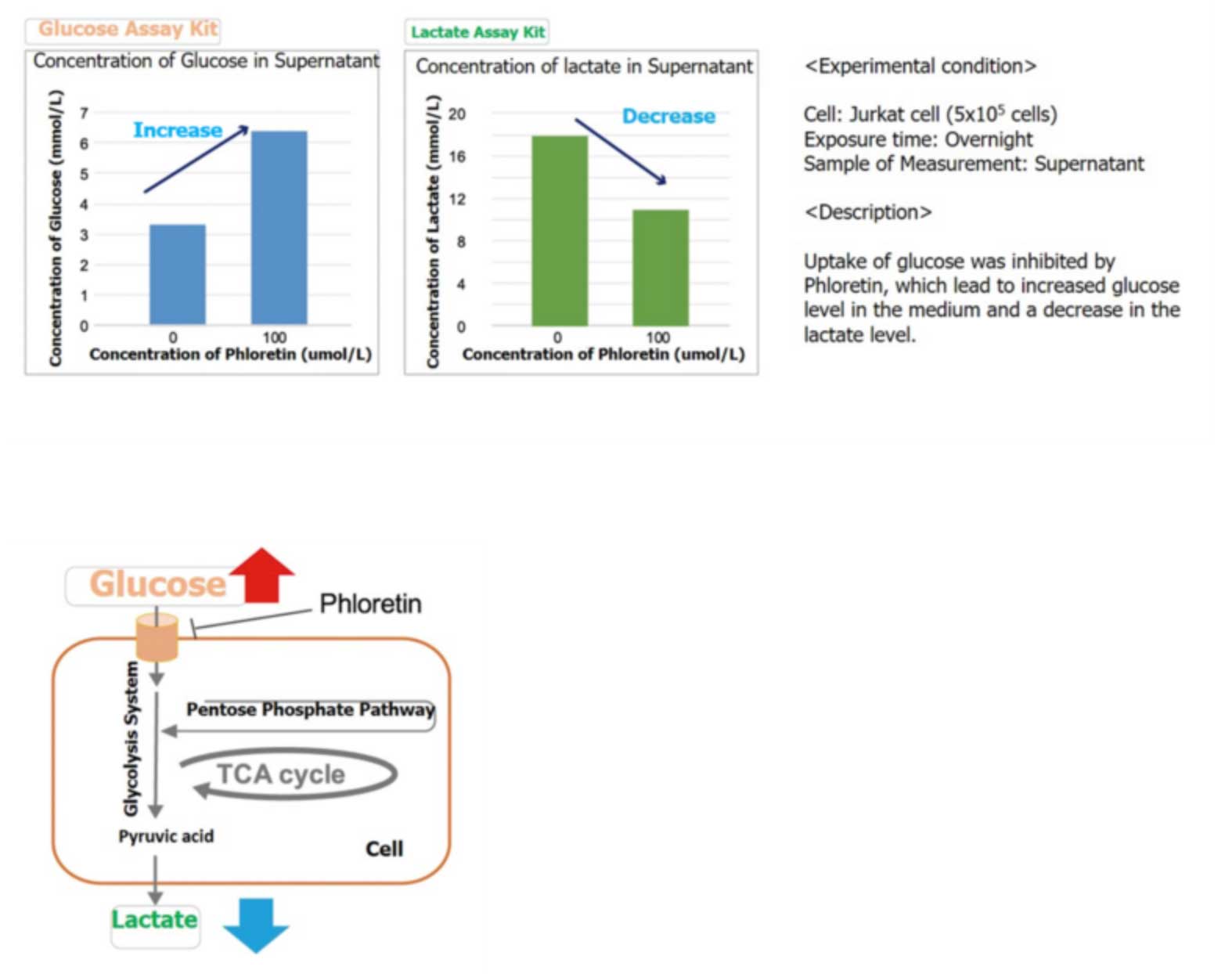 By using Glucose Assay Kit-WST and Lactate Assay Kit-WST, we have successfully measured metabolic activity changes of phloretin, a protein transport inhibitor, when it is added to Jurkat cells.
