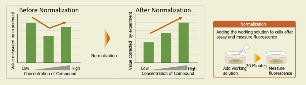 Cell counts may need to be normalized. When cells are analyzed in a microplate, the results obtained may sometimes differ depending on cell numbers per well.In such cases, normalization of the measured values obtained from cell counting and total protein will be necessary.In this kit, cell numbers can be easily measured by the fluorescence intensity induced by a reagent added to cell culture medium for staining nuclei.