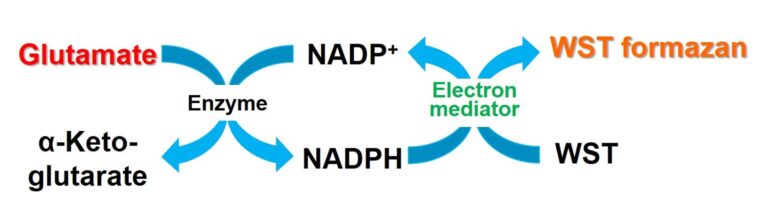 Our Glutamate Assay Kit-WST is designed to quantify glutamate as a metabolite. This kit allows you to quantify glutamate present in culture medium or intracellular glutamate by WST reduction reaction. The lowest concentration of glutamate which can be quantified is 5 μmol/l. This kit can be used with 96-well microplates, which makes it possible to analyze multiple specimens.