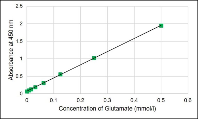 The kit is used to detect Glutamate in cell culture medium by measuring the absorbance of WST formazan produced according to quantities of glutamate. The kit includes a “Glutamate Standard” which can be used to quantify the concentration of lactate found within samples by creating standard curve.