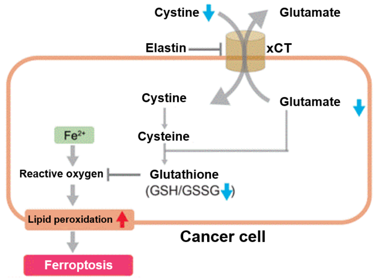 It is known that an iron-dependent cell death called “ferroptosis” is induced when xCT is inhibited by elastin treatment. The amounts of glutamate release and intracellular glutathione were measured by using the elastin-treated A549 cells. As a result, the amount of glutamate release was decreased in the elastin-treated A549 cells, and the amount of intracellular glutathione was decreased by inhibiting cystine uptake.