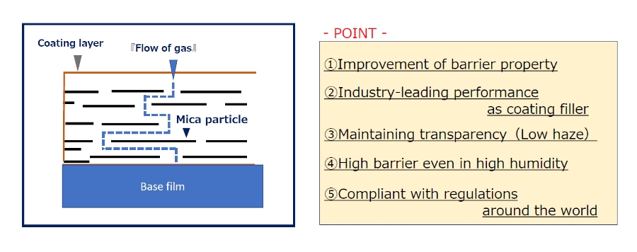 By blending synthetic mica with aqueous resin, high-purity, thinly layered mica particles are oriented on the substrate. The number of particles increases due to the swelling ability and cleavage effect that are not found in natural products, and the barrier property is demonstrated by the maze effect.