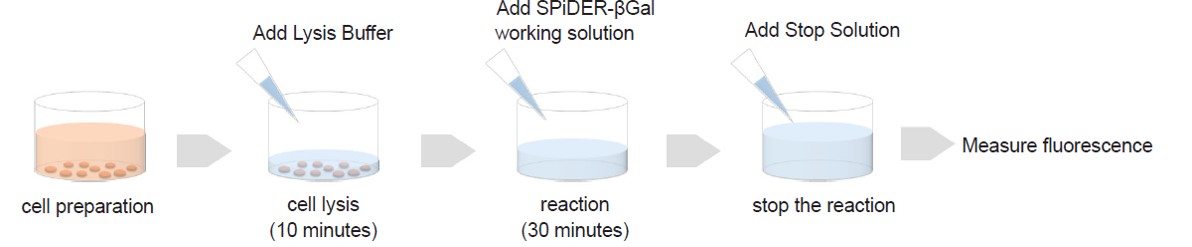 Cells prepared in advance are lysed in the buffer supplied with this kit.Fluorescence intensity is obtainable according to SA-β-gal activity simply by adding the fluorescent substrate SPiDER-βGal to the cell lysate. Even when you prepare cells in 100 mm dishes or others, fluorescence intensity can be measured by transferring cell lysate in 96 well plates after cell lysis.
