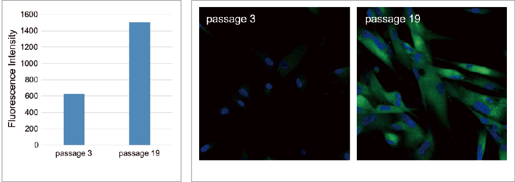 As a result, it was confirmed that in both kits, SA-β-gal staining increased in the high-passage WI-38 cells.