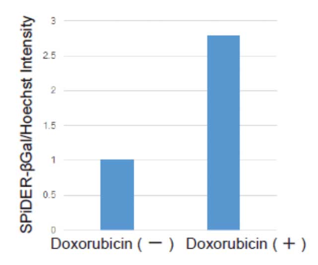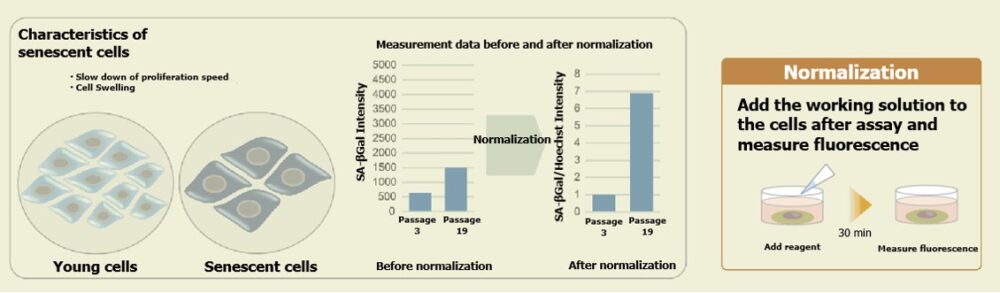 This product is a simple detection kit by plate assay for senescence-associated β-galactosidase (SA-β-gal) activity which is used as a marker for senescent cells. By simply adding SPiDER-βGal, a reagent for detection of β-galactosidase, to 96 well plates, this kit allows you to quantify SA-β-gal activity and makes it possible to evaluate multiple specimens. When normalization is done by the results obtained by counting cells, quantifying nucleic acids (the relevant product), or quantifying proteins, the measured values obtained using this kit become available for evaluating SA-β-gal activity according to cell number.