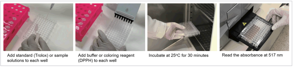 When measuring antioxidant activity with DPPH, the pH and solvent concentration in the solution affect the measurement. This product uses protocols and analysis methods to minimize these effects.