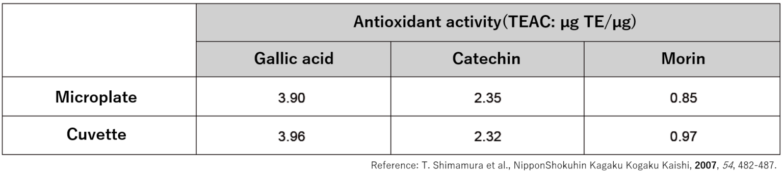 Similar to the above experiment, three antioxidants were measured using a microplate and calculated as Trolox equivalent activity values. As a result, almost the same measurement results were obtained. This kit uses a microplate for measurement.