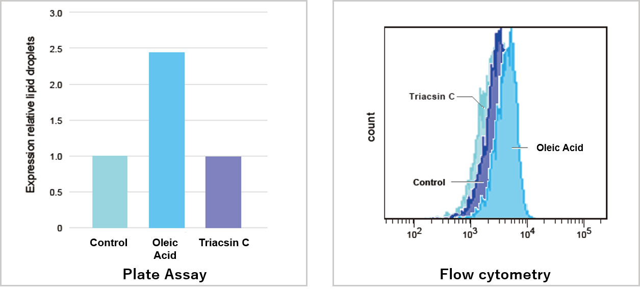 The fluorescent dye provided in the Lipid Droplet Assay Kit can be used for live and fixed cells. Compared to a method of using a colorimetric reagent, the method of using the Lipid Droplet Assay Kit can shorten measuring time. Furthermore, the repeatability of experiment can be increased by using the Lipid Droplet Assay Kit because the dye is not deposited in a plate.