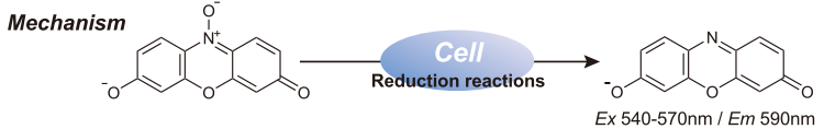 Resazurin, when added to viable cells, is reduced by the cellular enzymatic or chemical reactions converting blue/non-fluorescent resazurin to highly fluorescent resorufin.